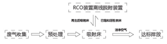 RCO離線式催化燃燒脫附設(shè)備是采用低溫催化氧化技術(shù),氣體通過熱交換到一定溫度后作為脫附。風(fēng)通過吸附床進(jìn)行脫附,第一步是催化劑對VOC分子的吸附,提高反應(yīng)物的濃度,第二步是催化氧化階段降低反應(yīng)物的活化物,提高反應(yīng)速率,借助催化劑使有機廢氣在較低的溫度下發(fā)生無氧燃燒,分解成二氧化碳和水并放出大量的熱,與直接燃燒相比,具有起燃溫度低,能耗小的特點。廢氣進(jìn)行有效收集后,先進(jìn)行預(yù)處理,再進(jìn)入分子篩或蜂窩活性炭吸附裝床,廢氣再吸附床層保持一定的停留時間,氣體中的VOCS被吸附在分子篩或活性炭表面,經(jīng)過吸附床后的潔凈氣體可以直接通過引風(fēng)機排空。將吸附飽和的碳床移動至脫附箱進(jìn)行脫附,脫附系統(tǒng)與生產(chǎn)線分離,從而杜絕生產(chǎn)線的安全隱患。